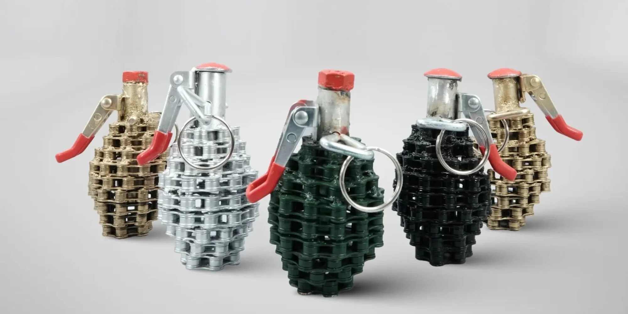 Look through gaps between chain links—nothing there. The void visible through rotation. Turn grenade around, peer into hollow centre. That absence suggests one answer: perhaps violence doesn't need meaning to continue."